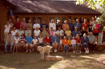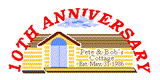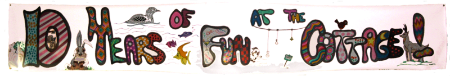 Another way to view the cottage history is based on significant events/parties held there. 1986 was the year of the tornado that went across the lake and damaged many properties. Forntunately, our place was minimally impacted. We also celebrated the 10th anniversary of the cottage that same weekend. The cottage magnet was created that year with a picture of it to the left. The Farritor's created the banner pictured above to help celebrate the occasion. In 1998, the ice pack from the Spring thaw rammed the boathouse and wiped out more than half the piers supporting it. The front of the boathouse was in the water. Repairs to the boat house are a continuing effort so that we can continue to use it. In the 2000 storm, Pete/Kristyn were at the cottage when a log went throuh the roof of the garage and windows were broken. In 2001, we celebrated the Michelle Swinehart and Dennis Harris wedding shower at the cottage. We were excited to have them up from Arizona. In 2002, we were joined in up-north land ownership by the Gamoke/Abts cottage on Papoose Lake. In 2006 for the 20th anniversary we had a Gamoke family reunion that was a great success in July. A new magnet was created that year.